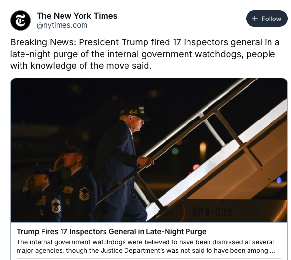 Fires 17 Inspectors General overnight. IG's are the watchdogs of government departments. However the law states that 30 days notice must be given to Congress. But the law doesn't matter anymore.